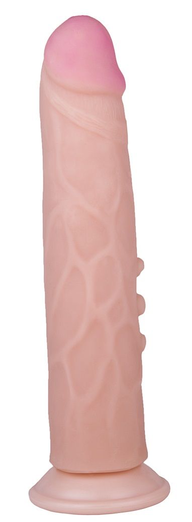 Большой фаллоимитатор подарит вам море удовольствия и феерических оргазмов. Сделан из реалистичного материала неоскин, иначе именуемого как «киберкожа», поэтому по ощущениям он на 100% напоминает настоящий пенис. Для дополнительной стимуляции вагины предусмотрены особые шишечки на имитаторе и венозный рельеф. Чтобы вы могли использовать игрушку в любых позах, и это было максимально удобно, есть специальная присоска, которая крепится к абсолютно любой гладкой поверхности.