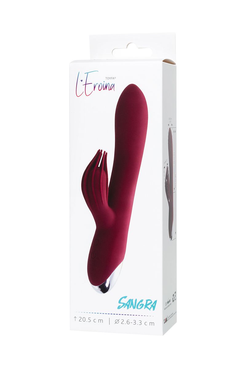 Вибратор Sangra создан для того чтобы удовлетворить все ваши желания и воплотить в жизнь самые смелые фантазии. Мягкая середина девайса позволяет ему слегка гнутся, так что вы без труда найдете идеальный угол для стимуляции, а нежные ворсинки на клиторальном отростке удвоят удовольствие. Для удобства использования кнопки устройства подсвечиваются во время включения и в процессе работы. К вашим услугам десять режимов вибрации и два мощных мотора. Изготовлен из легкого в эксплуатации, нетоксичного, гипоаллергенного силикона. Вибратор Sangra от L’EROINA идеально подходит для начинающих и опытных пользователей! Рабочая длина - 13 см. Диаметр клиторального отростка - 2,6 см.